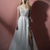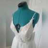 Beautiful tulle A-line skirt with a high slit. Ivory cream embroidered A-line gown, sweetheart bodice with spaghetti straps and cashmere lining, sheer scoop back with sequined appliqué, organza A-line skirt with slit. Smoke-free home.